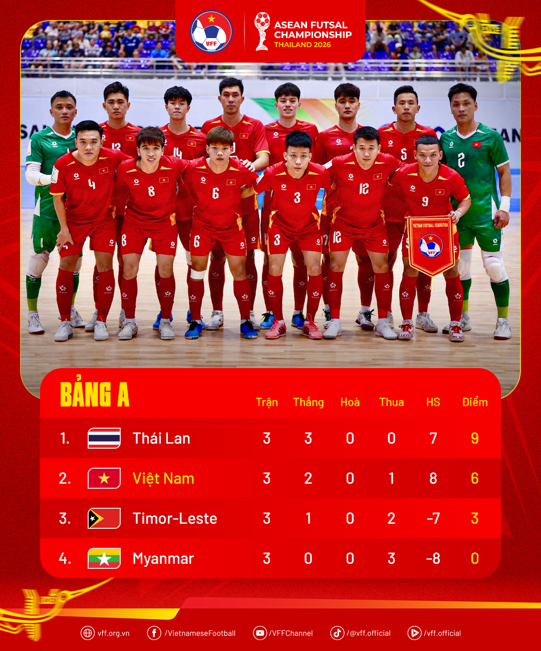 Với kết quả này, Thái Lan giành ngôi nhất bảng A, trong khi đội tuyển futsal Việt Nam xếp nhì bảng. Theo đó, tại vòng bán kết diễn ra ngày 10/4, thầy trò HLV Diego Giustozzi sẽ đối đầu với Indonesia – đội đứng đầu bảng B, trong khi Thái Lan gặp Australia.