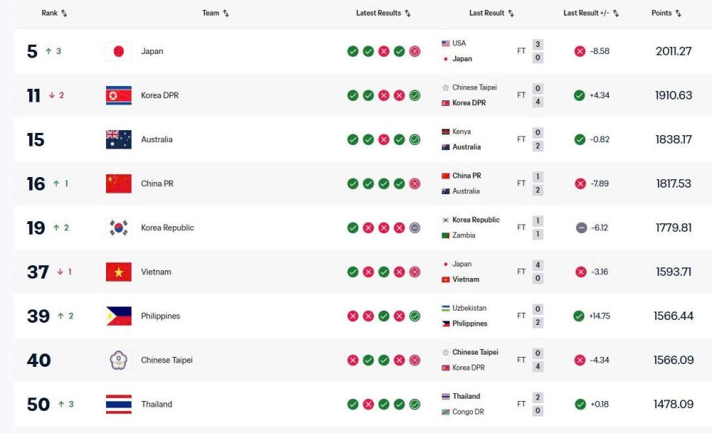 Tại châu Á, ĐT nữ Việt Nam đứng thứ 6, sau các đội Nhật Bản (hạng 5), CHDCND Triều Tiên (11), Australia (15), Trung Quốc (16) và Hàn Quốc (19), đồng thời xếp trên Philippines (39), Đài Bắc Trung Hoa (40) và Thái Lan (50). Ở khu vực Đông Nam Á, dù giảm 1 bậc trên BXH FIFA, đội tuyển nữ Việt Nam vẫn duy trì vị trí dẫn đầu, Tiếp theo là Philippines, Thái Lan, Myanmar, Malaysia, Indonesia, Lào, Campuchia, Singapore và Timor-Leste.