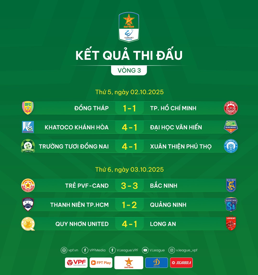 Kết quả thi đấu Vòng 3 Giải HNQG Bia Sao Vàng 2025/26 04/10/2025 14:46:53 Bóng đá nam Giải Hạng Nhất Quốc gia (V.League 2) Lịch thi đấuTin liên quan Kết quả thi đấu vòng 2 giải HNQG Bia Sao Vàng 2025/26 Kết quả thi đấu Vòng 1 giải HNQG Bia Sao Vàng 2025/26 Kết quả thi đấu Vòng 22 Giải Hạng nhất Quốc gia – Bia Sao Vàng 2024/25 Kết quả thi đấu Vòng 21 Giải Hạng nhất Quốc gia – Bia Sao Vàng 2024/25 Kết quả thi đấu Vòng 20 Giải HNQG Bia Sao Vàng 2024/25