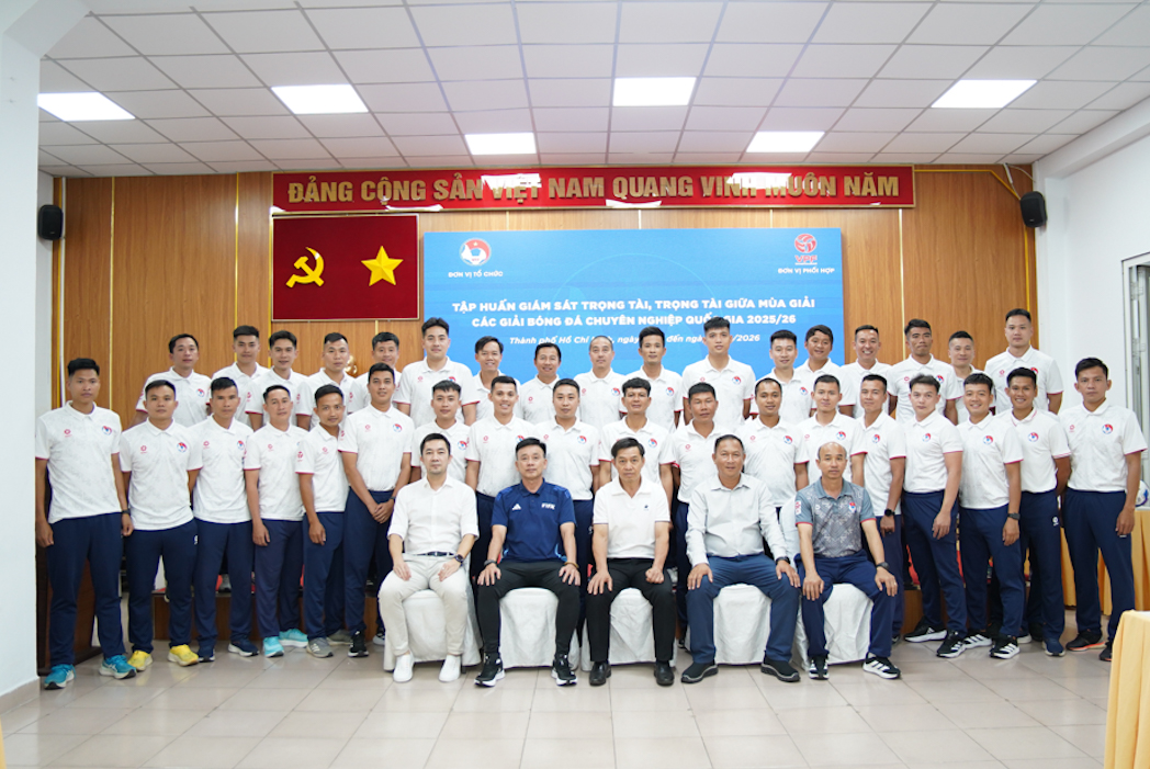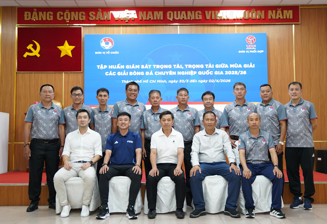 Chiều 30/3, tại Hội trường TDTT Thống Nhất (TP.HCM), LĐBĐVN phối hợp với Công ty Cổ phần Bóng đá Chuyên nghiệp Việt Nam (VPF) tổ chức khai mạc lớp tập huấn đợt 2 giữa mùa giải các giải bóng đá chuyên nghiệp quốc gia 2025/26 dành cho lực lượng giám sát trọng tài, trọng tài.