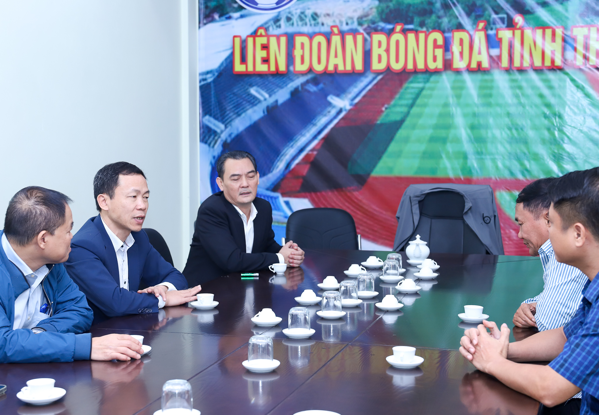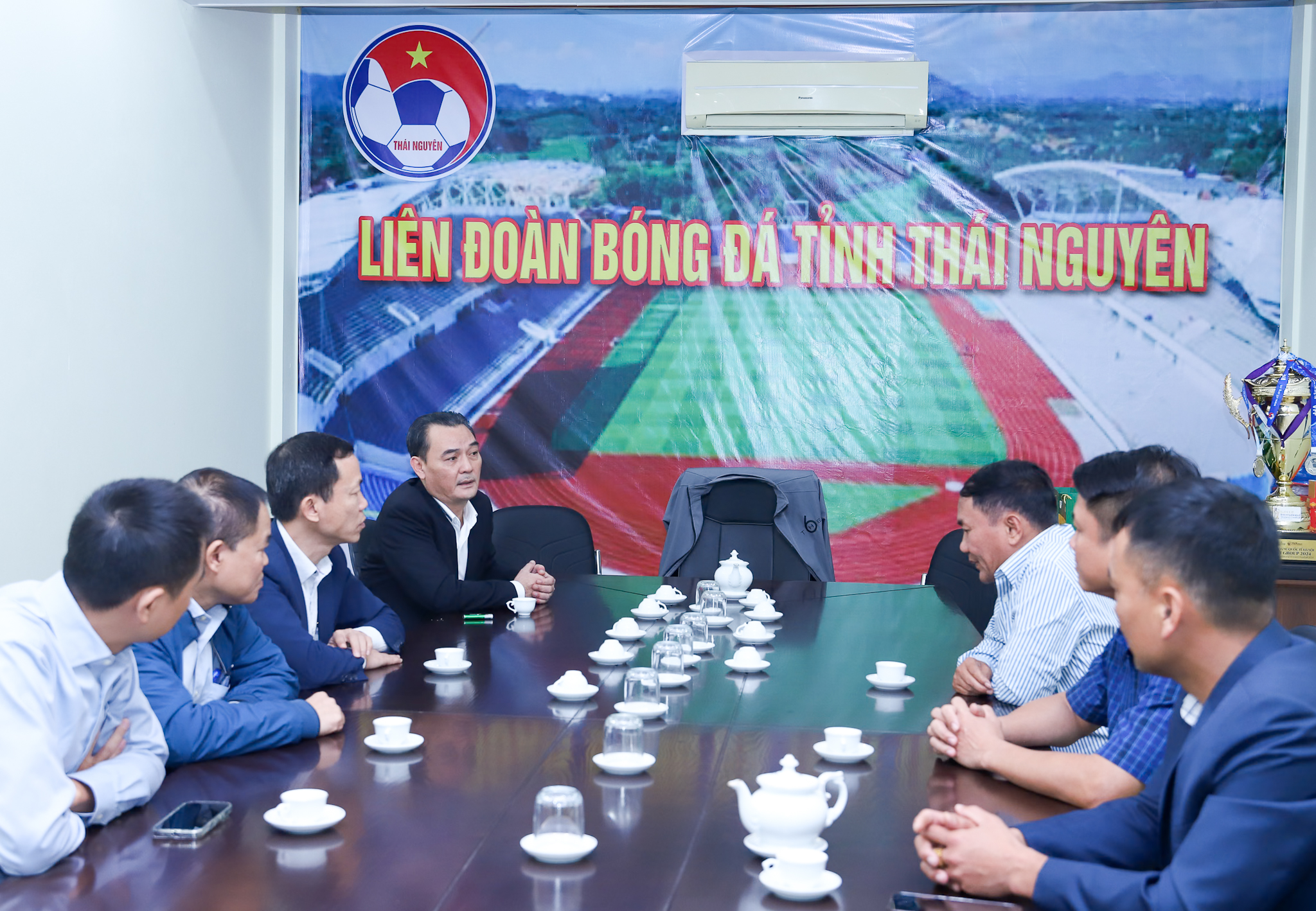 Tiếp đoàn công tác LĐBĐVN, về phía địa phương có ông Lưu Công Sơn – Chủ tịch LĐBĐ tỉnh Thái Nguyên, ông Đoàn Việt Triều – Tổng thư ký LĐBĐ tỉnh Thái Nguyên và ông Phạm Ngọc Quang – Giám đốc Trung tâm Huấn luyện & Thi đấu thể thao tỉnh Thái Nguyên.