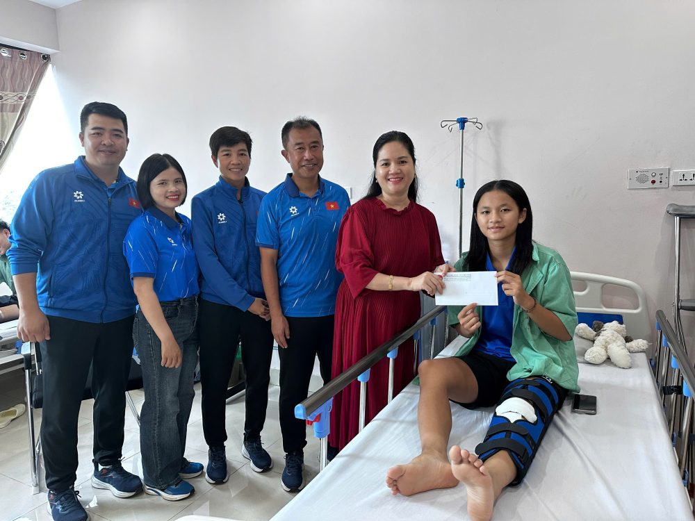Sáng nay (28/10), Phó Tổng Thư ký Liên đoàn Bóng đá Việt Nam (LĐBĐVN) Nguyễn Thanh Hà cùng HLV trưởng các đội tuyển nữ trẻ Việt Nam – ông Okiyama Masahiko, đại diện thành viên ban huấn luyện và đại diện phòng chức năng của LĐBĐVN đã đến thăm, động viên hai cầu thủ Nguyễn Vân Anh và Nguyễn Thị Thủy – thành viên Đội tuyển U16 Nữ Quốc gia đang điều trị chấn thương tại Bệnh viện Thể thao Việt Nam.