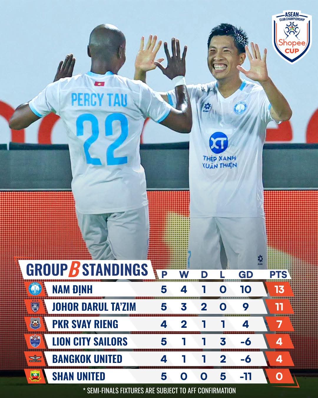 Dù đánh rơi chiến thắng đầy tiếc nuối, CLB Nam Định vẫn hoàn thành mục tiêu khi kết thúc vòng bảng với vị trí số một bảng B. Đối thủ của thầy trò HLV Mauro tại vòng bán kết Shopee Cup 2025/26 sẽ là Selangor FC của Malaysia.