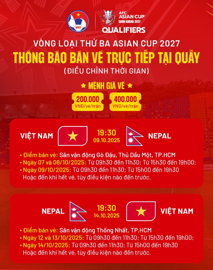 Đợt 1: Từ 09h00 ngày 29/09/2025 đến 23h59 ngày 05/10/2025 (khách hàng có thể mua đồng thời vé xem Trận đấu lượt đi giữa ĐT Việt Nam vs ĐT Nepal thuộc Vòng loại cuối Asian Cup 2027, diễn ra ngày 09/10/2025 tại Sân vận động Gò Đậu, Thủ Dầu Một, TP.HCM và Trận đấu lượt về giữa ĐT Nepal vs ĐT Việt Nam thuộc Vòng loại cuối Asian Cup 2027, diễn ra ngày 14/10/2025, tại Sân vận động Thống Nhất – TPHCM);