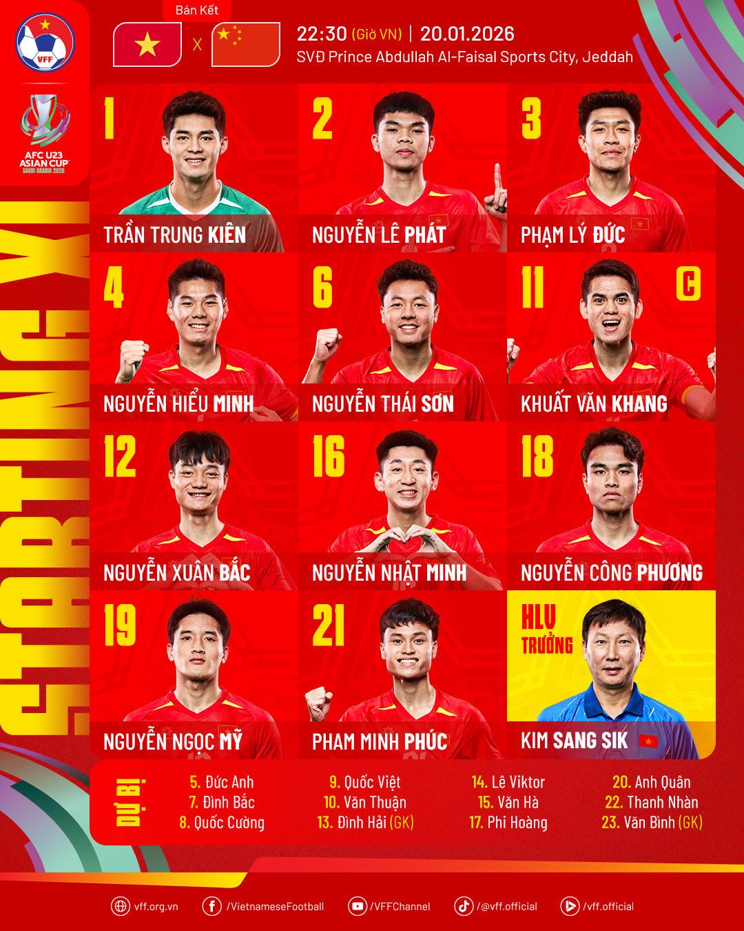 So với trận tứ kết, HLV Kim Sang Sik chỉ có một sự điều chỉnh trong đội hình xuất phát khi Công Phương đá thay Lê Viktor. Trong khi đó, U23 Trung Quốc thay đổi tới sáu vị trí, đặc biệt là trên hàng công, cho thấy rõ ý đồ chuyển từ thế trận phòng ngự sang chủ động tấn công của HLV Antonio Puche Vicente. Đội bóng Đông Á nhập cuộc với đội hình dâng cao, kiểm soát khu trung tuyến và gây sức ép ngay từ đầu, khiến U23 Việt Nam phần nào gặp khó trong việc triển khai lối chơi.