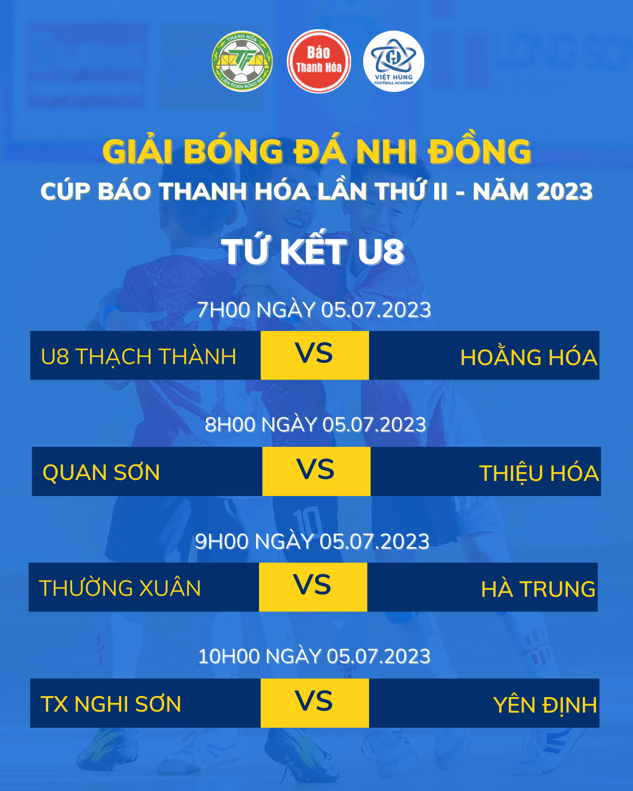 Theo lịch thi đấu, các trận đấu tứ kết lứa tuổi U8 sẽ diễn ra vào sáng ngày 5-7, từ lúc 7h00.