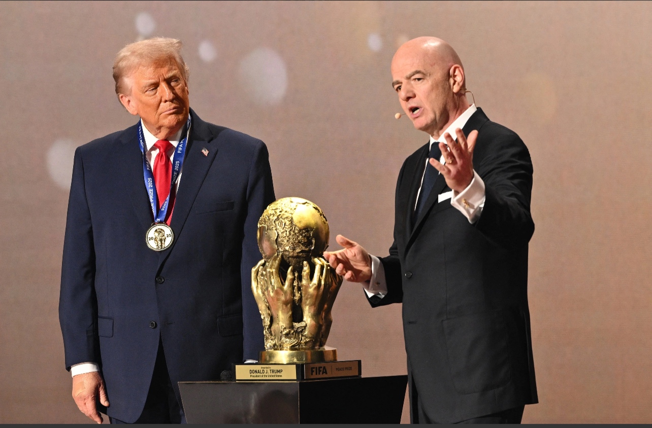 Tổng thống Mỹ Donald Trump (trái) được Chủ tịch FIFA Gianni Infantino trao giải thưởng Hòa bình FIFA. Ảnh: Reuters