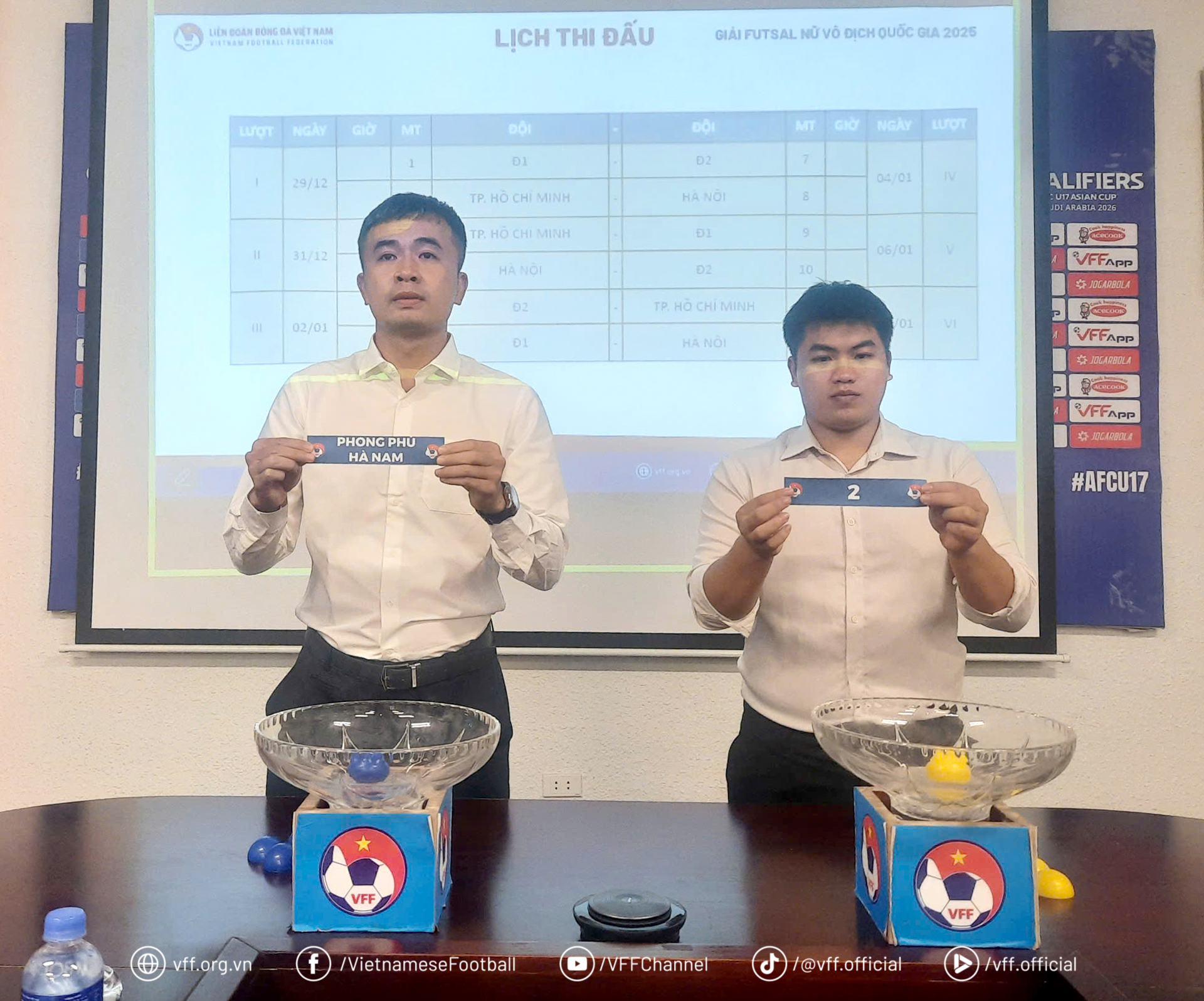 Chiều 5/12, tại trụ sở Liên đoàn Bóng đá Việt Nam (LĐBĐVN) đã diễn ra lễ bốc thăm và xếp lịch thi đấu Giải futsal nữ Vô địch quốc gia 2025. Buổi lễ được tiến hành qua hình thức trực tuyến với sự theo dõi của đại diện các đội bóng và bộ phận chuyên môn của LĐBĐVN.
