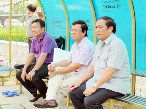 | Chủ tịch VFF Nguyễn Trọng Hỷ, PCT VFF Phạm Ngọc Viễn, HLV trưởng Hoàng Văn Phúc theo dõi buổi tập của ĐTQG |