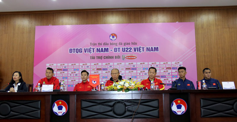 Nhằm phục vụ công tác chuyên môn cho ĐTQG và ĐT U22 QG hướng tới các mục tiêu quan trọng của năm 2021, LĐBĐVN đã lên kế hoạch tổ chức hai trận đấu giao hữu giữa hai đội tuyển vào ngày 23/12 và 27/12 sắp tới. Sáng nay (21/12), tại trụ sở LĐBĐVN, HLV trưởng Park Hang-seo và đại diện cầu thủ hai đội tuyển đã có buổi trao đổi thông tin với báo chí.