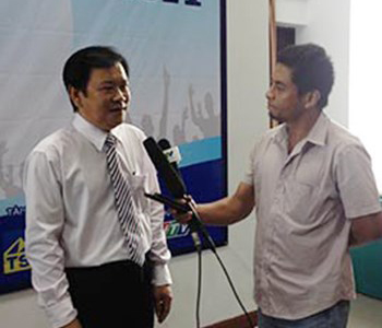 | Ông Mai Ngọc Phước, phó tổng biên tập phụ trách báo Pháp Luật TP. HCM, trưởng BTC giải Fair Play 2014 đang trả lời phỏng vấn phóng viên truyền hình. |
