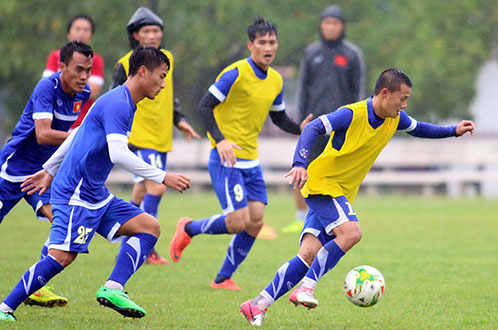 | Thành Lương (bìa phải) và đồng đội trong buổi tập hôm qua tại Hà Nội – Ảnh: N.K |