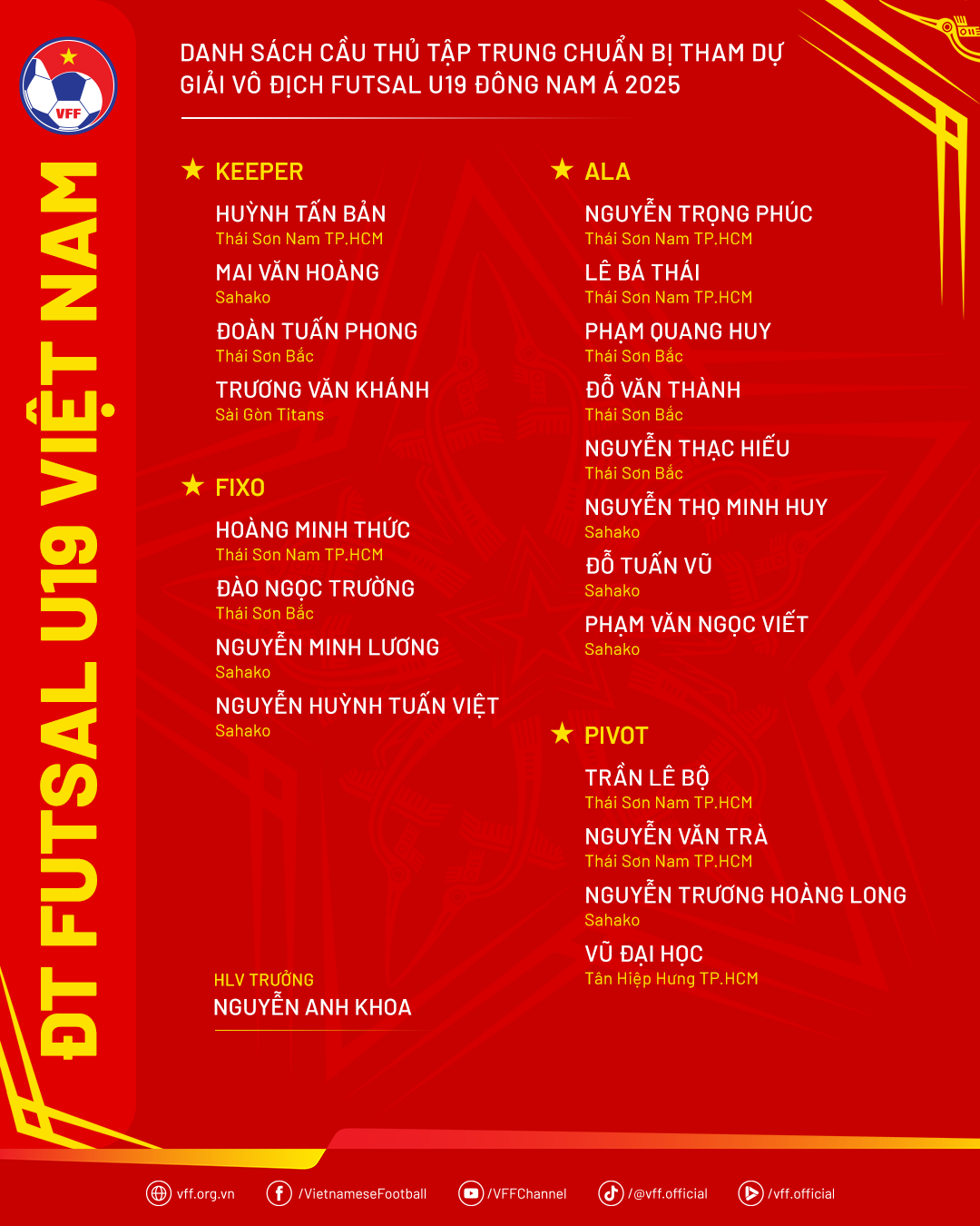 Danh sách Đội tuyển futsal U19 Việt Nam chuẩn bị tham dự Giải futsal U19 Đông Nam Á 2025 26/11/2025 17:04:46 Futsal Đội tuyển U19/U20 Futsal Quốc Gia Danh sáchTin liên quan Danh sách Đội tuyển futsal U19 Việt Nam tập huấn đợt 1 năm 2024 Danh sách ĐT U20 futsal Việt Nam tập huấn và tham dự VCK U20 futsal châu Á 2019 tại Iran Danh sách ĐT U20 Futsal Việt Nam tập trung chuẩn bị tham dự VL Giải Futsal U20 châu Á 2019 Danh sách ĐT U20 Futsal Việt Nam tập trung chuẩn bị tham dự Giải vô địch U20 futsal châu Á 2017