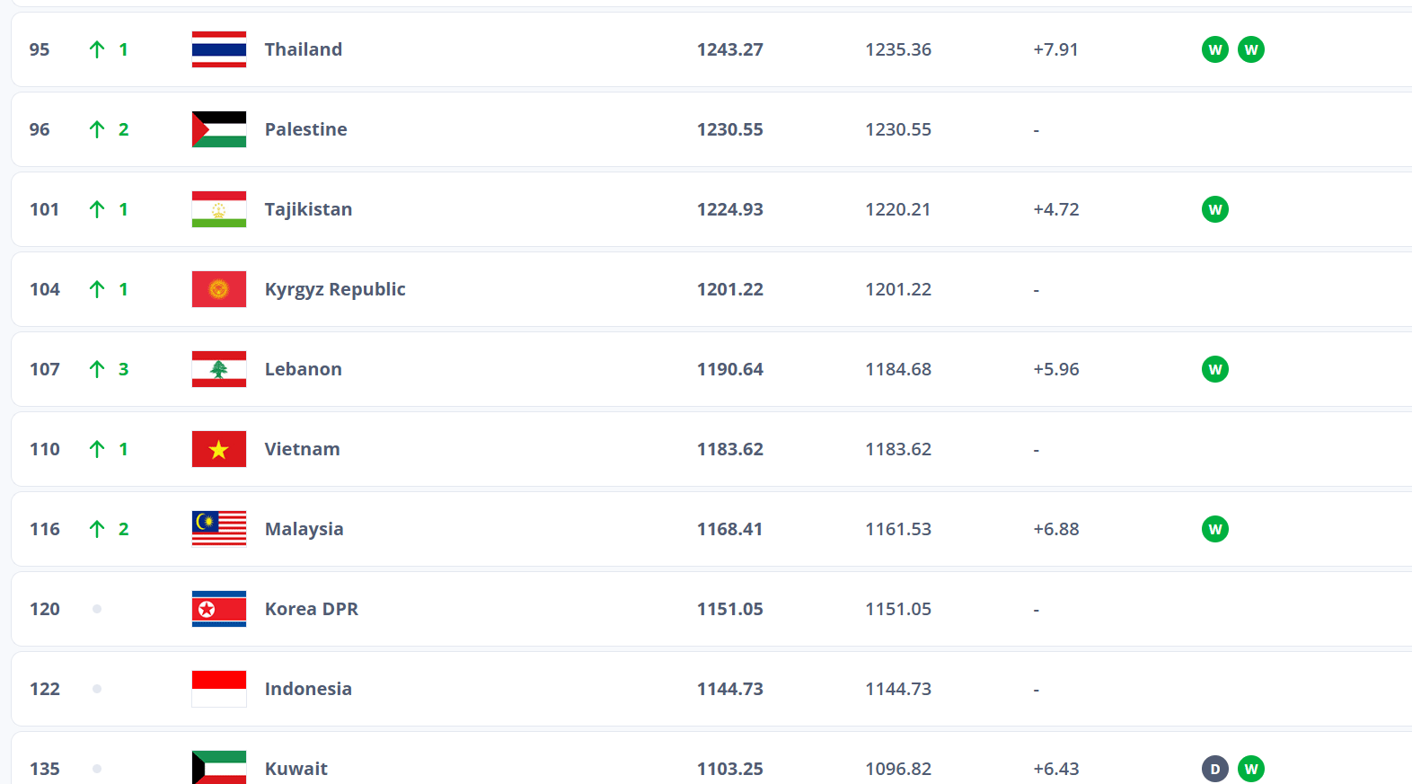 Trên bảng xếp hạng châu Á, dẫn đầu vẫn là Nhật Bản, tiếp đó đến Iran và Hàn Quốc; đội tuyển Việt Nam đứng thứ 20, đồng thời tiếp tục giữ vị trí thứ 2 Đông Nam Á, sau Thái Lan. Việc tăng bậc trên bảng xếp hạng FIFA được xem là nguồn động lực quan trọng cho đội tuyển Việt Nam trong giai đoạn chuẩn bị cho các nhiệm vụ sắp tới. Điều này không chỉ củng cố vị thế của bóng đá Việt Nam tại khu vực mà còn mang đến tín hiệu lạc quan cho người hâm mộ trong thời điểm đội tuyển đang nỗ lực nâng cao phong độ và cải thiện thành tích thi đấu và hướng tới các mục tiêu dài hạn.