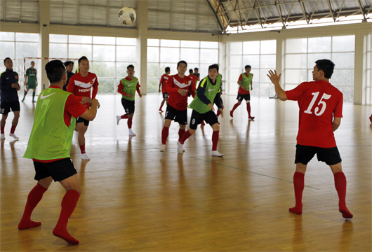 Do các cầu thủ vừa trải qua lượt trận đấu căng thẳng tại V-League 2014 và điều kiện thời tiết không thuận lợi nên HLV trưởng Hoàng Văn Phúc quyết định chỉ triển khai các bài tập mang tính thư giãn, thả lỏng tâm lý trong nhà tập futsal thuộc trung tâm đào tạo trẻ. Các bài tập chơi với bóng nhưng đòi hỏi khả năng di chuyển linh hoạt và tính tập thể rất cao đã tạo nên không khí rất sôi động trong nhà tập. Các tân binh như Hữu Long, Văn Hiếu, Nguyên Mạnh thể hiện sự bắt nhịp rất tốt với môi trường đội tuyển trong khi các cựu binh đều cho thấy sự sẵn sàng cho guồng quay mới.