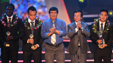 | Phó chủ tịch VFF Nguyễn Xuân Gụ (giữa) và TGĐ VPF Phạm Ngọc Viễn trao giải thưởng cho các cầu thủ trong đội hình tiêu biểu của mùa giải chuyên nghiệp 2014 |