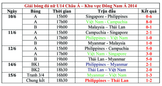 Kết quả chung cuộc giải bóng đá nữ U14 Châu Á – khu vực Đông Nam Á 2014: – Đội vô địch: U14 Thái Lan – Đội thứ Nhì: U14 Philippines – Đội thứ Ba: U14 Việt Nam – Đội đoạt giải hong cách: U14 Philippines – Cầu thủ xuất sắc nhất: Joyce Omboy Semacio (8- U14 Philippines) – Cầu thủ ghi nhiều bàn thắng nhất: Trần Thị Hải Linh (9 – U14 Việt Nam) |