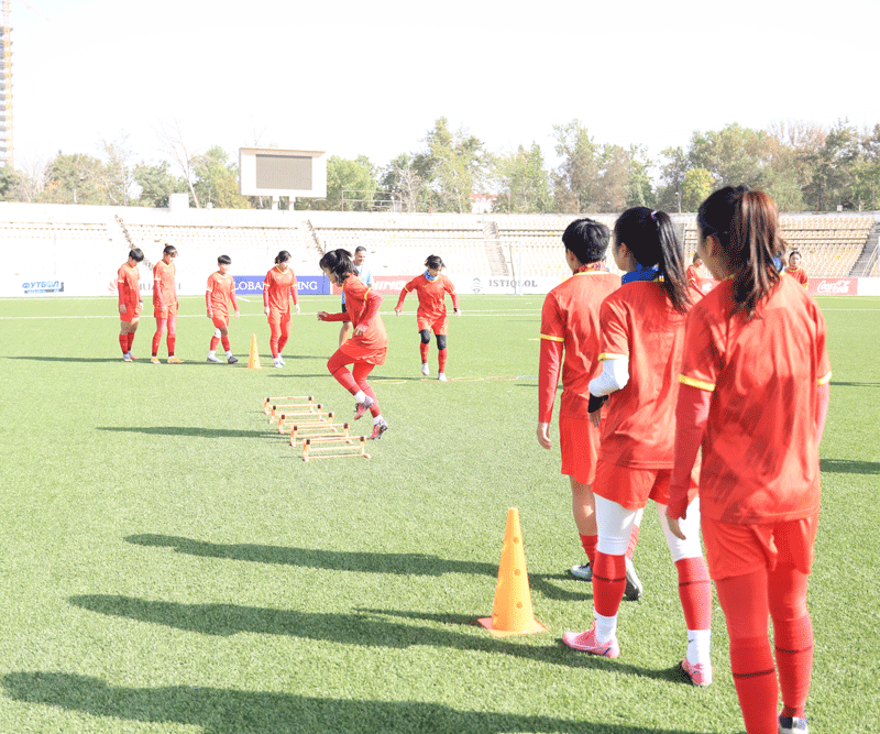 ĐT nữ Việt Nam tích cực tập luyện chuẩn bị cho trận đấu cuối cùng với chủ nhà Tajikistan. Ảnh VFF