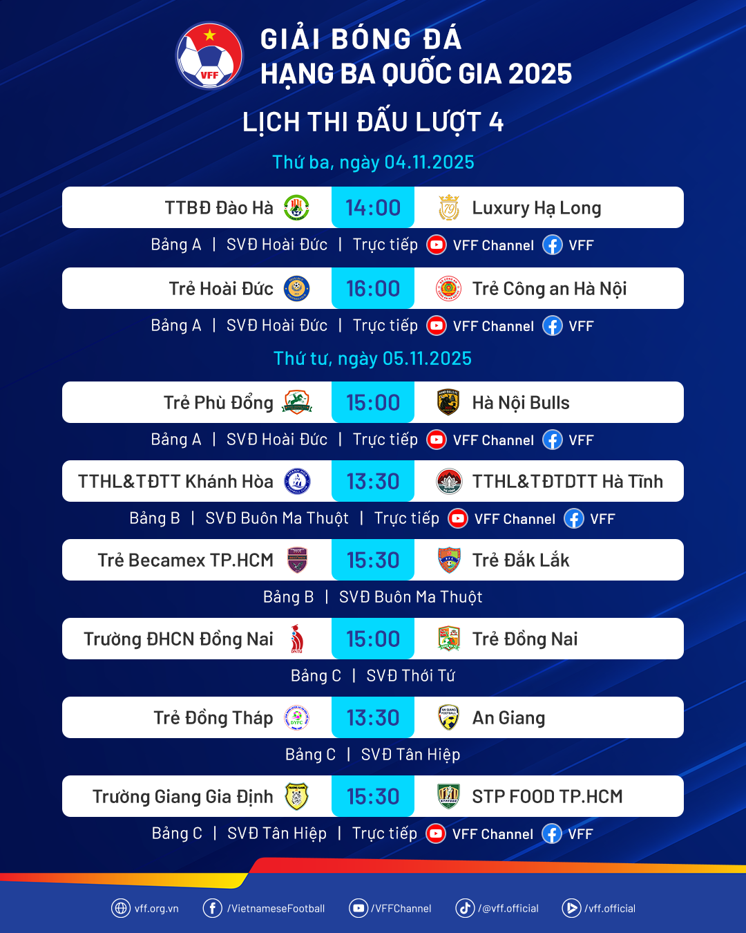 Các trận đấu còn lại của lượt 4 tại bảng B và bảng C sẽ diễn ra vào chiều 5/11, hứa hẹn tiếp tục mang đến nhiều diễn biến hấp dẫn trong cuộc đua giành suất thăng hạng.