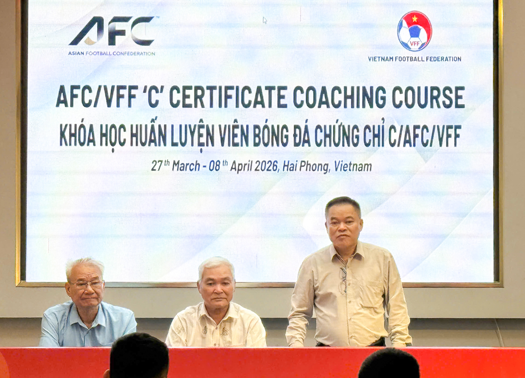 Sáng 27/3, tại hội trường SVĐ Lạch Tray (Hải Phòng) đã diễn ra lễ khai giảng khóa học HLV bóng đá chứng chỉ C/AFC/VFF năm 2026, do LĐBĐVN phối hợp với CLB Bóng đá Hải Phòng tổ chức. Khóa học diễn ra từ 27/3 đến 8/4/2026, với sự tham gia của 24 học viên đến từ các câu lạc bộ, trung tâm bóng đá và cơ sở đào tạo thể thao trên toàn quốc.