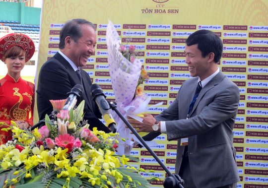 | Phó chủ tịch HĐQT, TGĐ Tập đoàn Hoa Sen Trần Ngọc Chu cùng đại diện BTC giải, BTC địa phương xuống sân tặng hoa cầu thủ U19 HAGL và U19 An Giang trước trận khai màn |