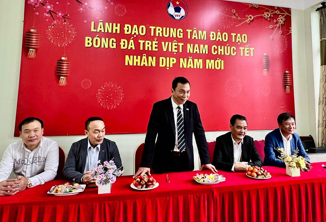 Chủ tịch LĐBĐVN Trần Quốc Tuấn và lãnh đạo LĐBĐVN chúc Tết cán bộ, nhân viên Trung tâm đào tạo bóng đá trẻ Việt Nam.