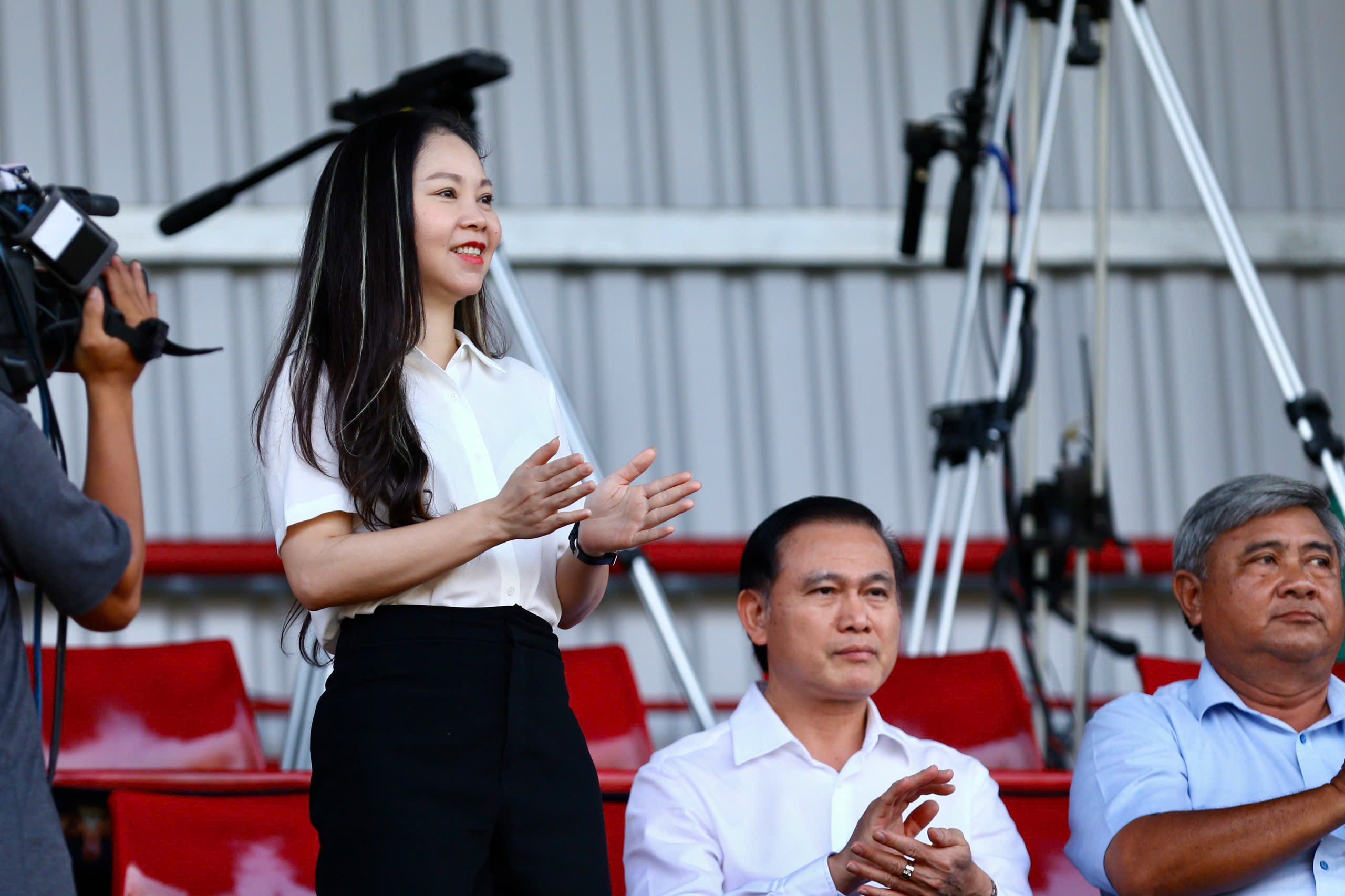 Ông Phạm Anh Dũng – Ủy viên Ban Trọng tài LĐBĐVN và bà Nguyễn Thị Liễu Điền – đại diện nhà tài trợ Acecook Việt Nam tặng thưởng Tổ trọng tài hoàn thành xuất sắc nhiệm vụ