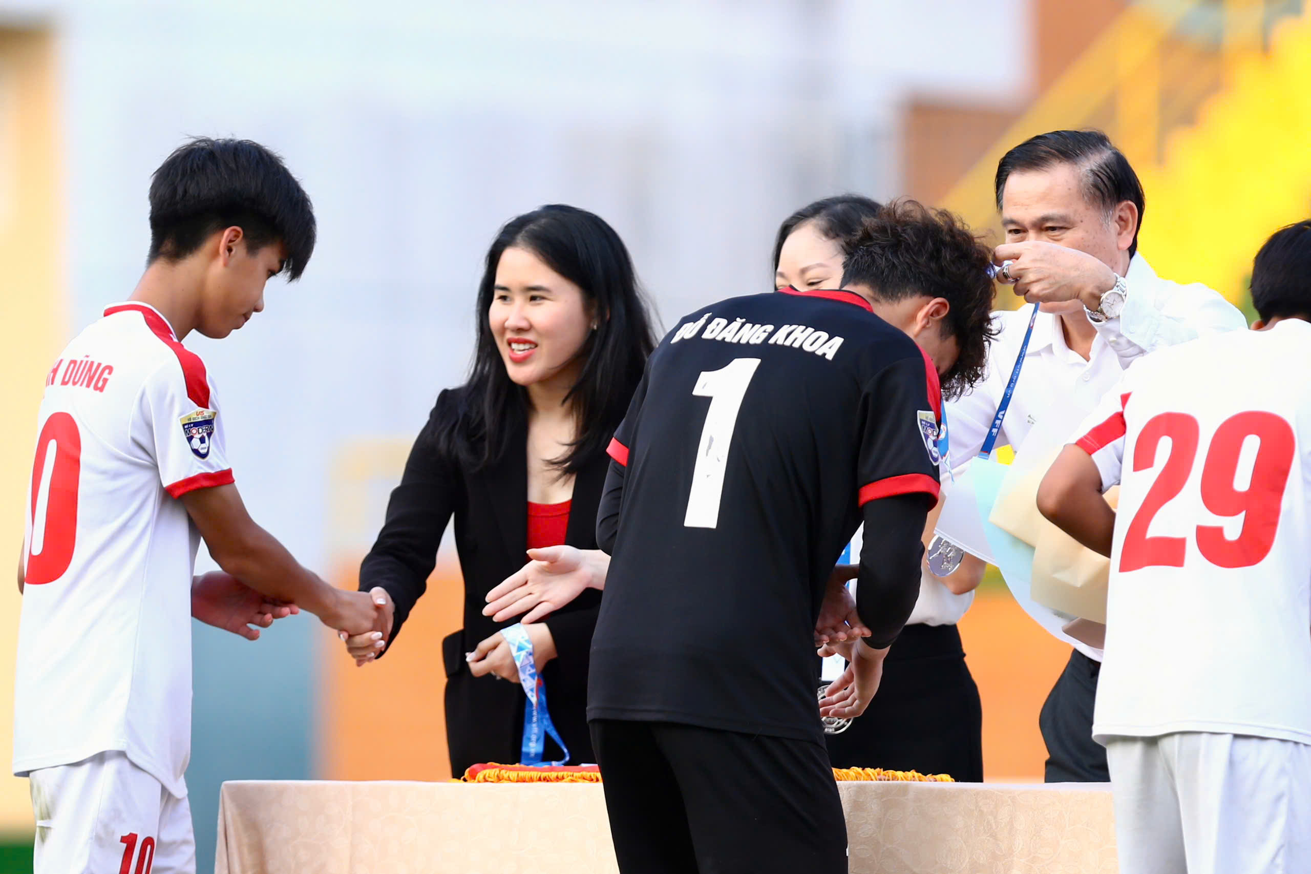 Bà Đinh Thị Thu Trang – Phó Tổng Thư ký LĐBĐVN, Trưởng Ban Tổ chức giải và bà Nguyễn Thị Liễu Điền – đại diện nhà tài trợ Acecook Việt Nam trao thưởng cho Cầu thủ xuất sắc nhất: Trần Huy Huỳnh (số 38) đội U15 Hà Nội I