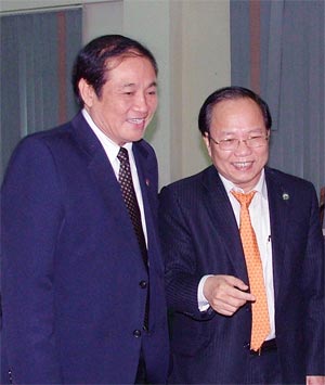 | Bộ Trưởng Bộ VH-TT-DL Hoàng Tuấn Anh bắt tay chúc mừng thành tích của đội tuyển nữ Việt Nam tại giải AFF Cup 2008 |