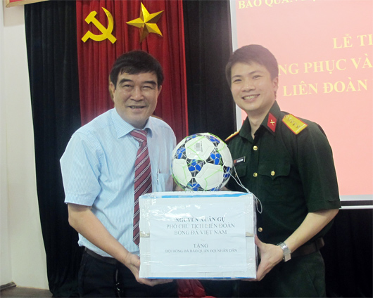 | Phó chủ tịch VFF Nguyễn Xuân Gụ tặng bóng & trang phục thi đấu cho đội bóng Báo QĐND |