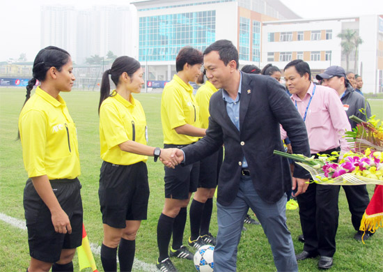 | Phó Tổng thư ký VFF kiêm Trưởng BTC vòng loại U19 nữ Châu Á 2015 tặng hoa cho tổ trọng tài làm nhiệm vụ trận U19 Australia gặp U19 Hong Kong |