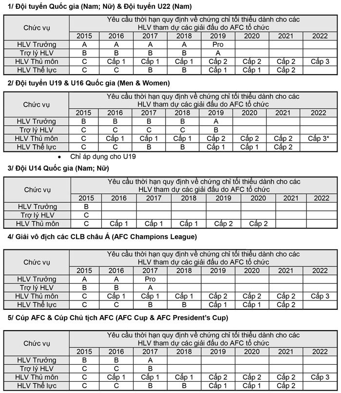 Liên đoàn Bóng đá Việt Nam nhận được công văn của Liên đoàn Bóng đá châu Á (AFC) thông báo cho các Liên đoàn Bóng đá Quốc gia áp dụng thời hạn bắt buộc quy định về chứng chỉ tối thiểu dành cho các HLV tham dự các giải đấu do AFC tổ chức. Cụ thể như sau: