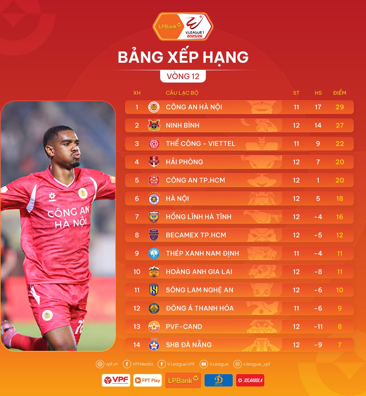 Bảng xếp hạng sau vòng 12 LPBank V.League 1-2025/26: