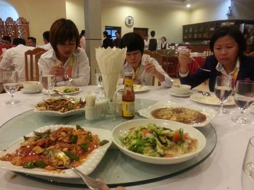 Sau khi làm thủ tục nhận phòng và lấy hành lý, hai đội đã có bữa tối muộn được phục vụ ngay tại nhà hàng của khách sạn với những món ăn địa phương. Cảm nhận ban đầu, hầu hết các món ăn đều được chế biến với nước sốt khá nhiều gia vị tạo cảm giác hơi ngấy. Món canh gần giống của Việt Nam song lại hơi cay và tương đối đặm. Do đã nắm được đặc điểm đồ ăn từ giải tiền SEA Games, ban huấn luyện cùng các cầu thủ hai đội đã chuẩn bị khá nhiều thực phẩm, đồ ăn mang sang để thay đổi món cho các cầu thủ.