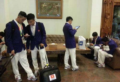 | Các cầu thủ tranh thủ vào internet bằng wifi của khách sạn trong lúc chờ xếp hành lý |