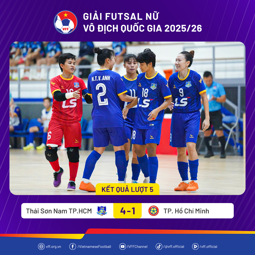 Với kết quả này, Thái Sơn Nam TP HCM khép lại 5 lượt trận với thành tích toàn thắng, tạo ra khoảng cách lên tới 8 điểm so với đội xếp sau. Thành tích ấn tượng này giúp đội bóng chính thức vô địch sớm Giải futsal nữ VĐQG 2025 trước 1 vòng đấu.