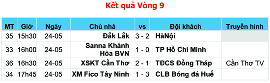 Ngày 24/05/2014, trên các sân Tây Ninh, Buôn Ma Thuật, Ninh Thuận, Cần Thơ sẽ diễn ra các trận đấu thuộc vòng 9 – Giải bóng đá HNQG Kienlongbank 2014
