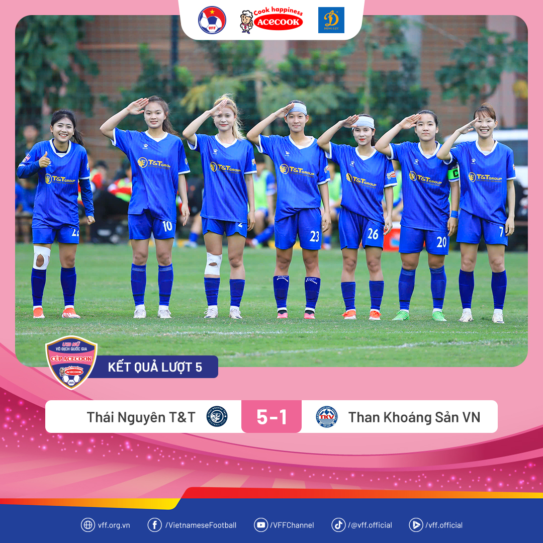 Trong khi đó, Thái Nguyên T&T có chiến thắng quá dễ dàng trước Than Khoáng Sản Việt Nam (Than KSVN). Ngay ở phút thứ 3, từ đường chuyền của Nguyễn Ngô Thảo Nguyên, Nguyễn Thu Trang dễ dàng đệm bóng vào lưới trống mở tỉ số trận đấu cho Thái Nguyên T&T. Đến phút 32, xuất phát từ tình huống lộn xộn trong vòng cấm, Đỗ Thị Thúy Nga dứt điểm cận thành nâng tỉ số lên 2-0. Đến thời điểm này, Than KSVN đánh mất tinh thần và dần vỡ trận. Hai phút sau, pha cản phá không tốt của thủ môn đối phương tạo điều kiện để Trần Thị Hương nâng tỉ số lên 3-0. Phút 37, Ngô Hải Yến đi bóng khéo léo vượt qua 2 hậu vệ Than KSVN trước khi dứt điểm chuẩn xác nới rộng cách biệt lên thành 4 bàn. Hiệp 1 trôi qua với lợi thế lớn nghiêng về phía đội bóng xứ chè.
