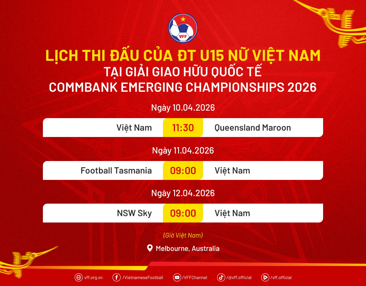 Tại Australia, U15 nữ Việt Nam sẽ tham dự Giải CommBank Emerging Championships 2026, diễn ra từ ngày 9/4 đến 15/4 tại Trung tâm Home of the Matildas (Bundoora, Melbourne). Đây là sân chơi phát triển tài năng trẻ uy tín của bóng đá Australia, quy tụ các đội trẻ hàng đầu và các đội khách mời quốc tế.