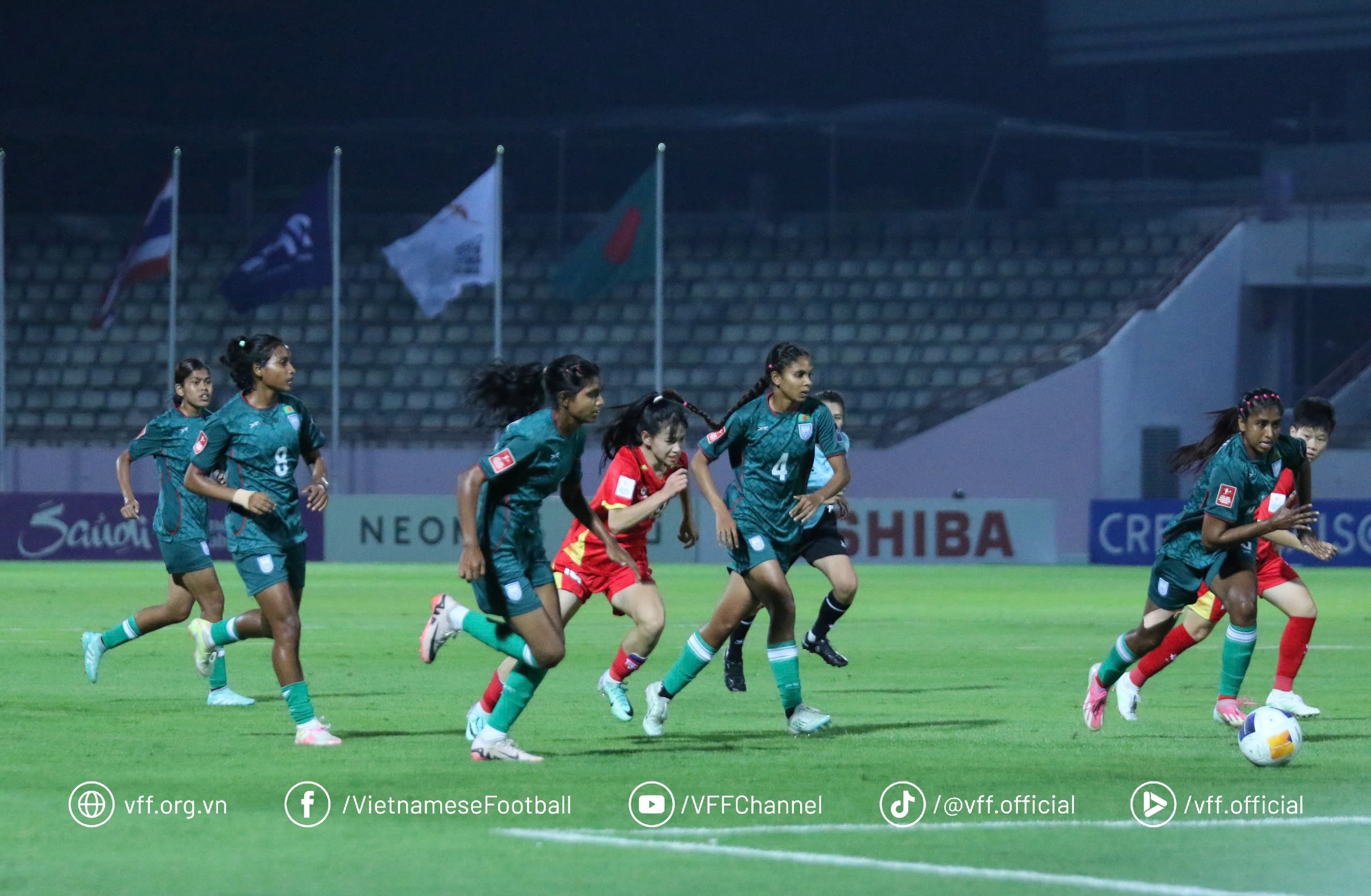Ngay sau tiếng còi khai cuộc, U20 nữ Việt Nam chủ động đẩy cao đội hình và tổ chức tấn công. Phút 9, Ngân Thị Thanh Hiếu có cơ hội xâm nhập vòng cấm nhưng pha xử lý cuối chưa thực sự hiệu quả. Ít phút sau, Bangladesh đáp trả bằng cú sút hướng về khung thành thủ môn Lê Thị Thu.