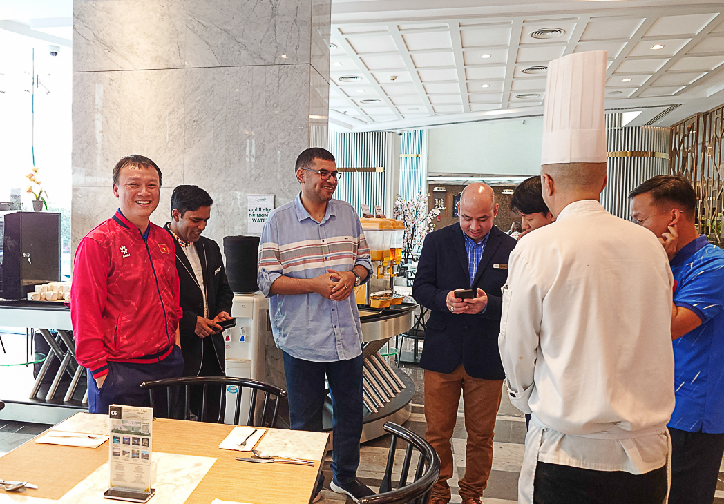 Sau khi ổn định nơi lưu trú tại Doha, các cầu thủ nhanh chóng dùng bữa và nghỉ ngơi, trước khi bước vào buổi tập gym hồi phục lúc 18h00 cùng ngày theo giờ địa phương. Trước đó, lãnh đội Đoàn Anh Tuấn đã có mặt tại Qatar sớm một ngày để thực hiện công tác tiền trạm, làm việc và thống nhất với Ban tổ chức địa phương về lịch sinh hoạt, tập luyện, tạo điều kiện thuận lợi nhất cho toàn đội. Trong những ngày đầu tại Qatar, nhiệm vụ điều chỉnh nhịp sinh học cũng được Ban huấn luyện đặc biệt chú trọng, trong bối cảnh múi giờ Qatar lệch 4 tiếng so với Việt Nam.