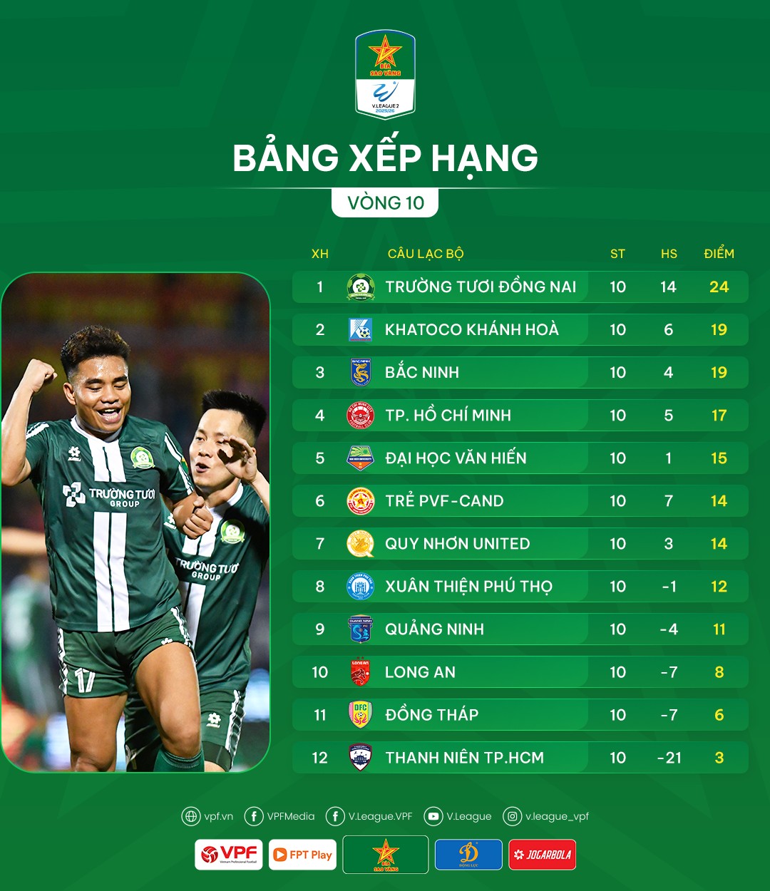 Cú bật nhảy của CLB Bắc Ninh khiến cuộc đua tốp đầu càng lúc càng hấp dẫn, khó dự đoán. Sau vòng 10, thầy trò HLV Paulo Foiani đã có 19 điểm, số điểm bằng với CLB Khatoco Khánh Hòa, tạm xếp vị trí thứ 3 do thua chỉ số phụ. CLB Bắc Ninh chỉ còn thua đội đầu bảng Trường Tươi Đồng Nai 5 điểm – số điểm hoàn toàn có thể “lật đổ” ở hành trình dài phía trước của mùa giải.