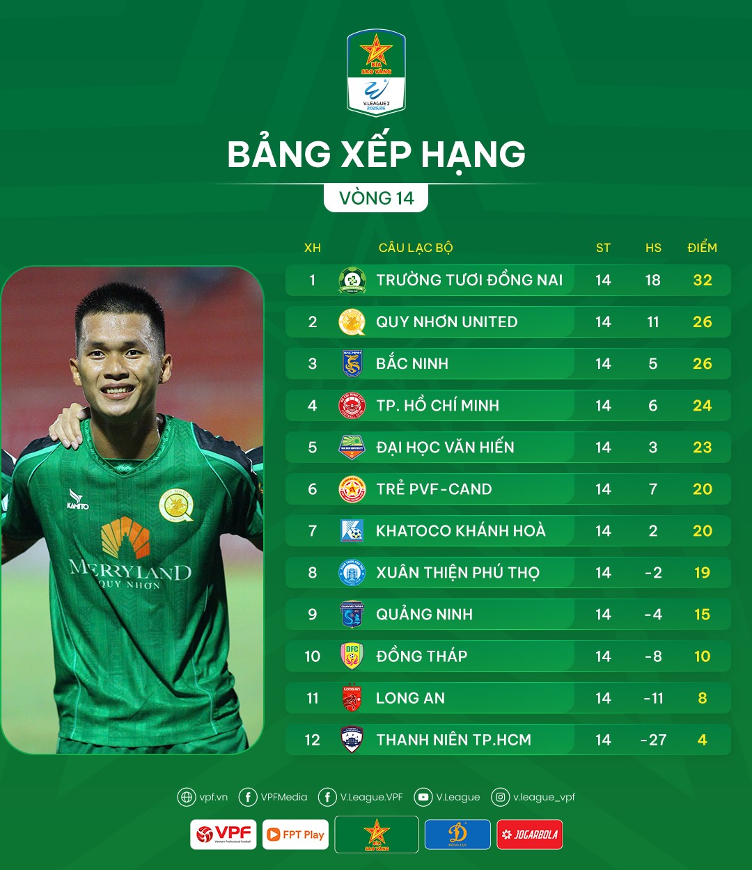 Bảng xếp hạng sau vòng 14 Giải HNQG Bia Sao Vàng 2025/26: