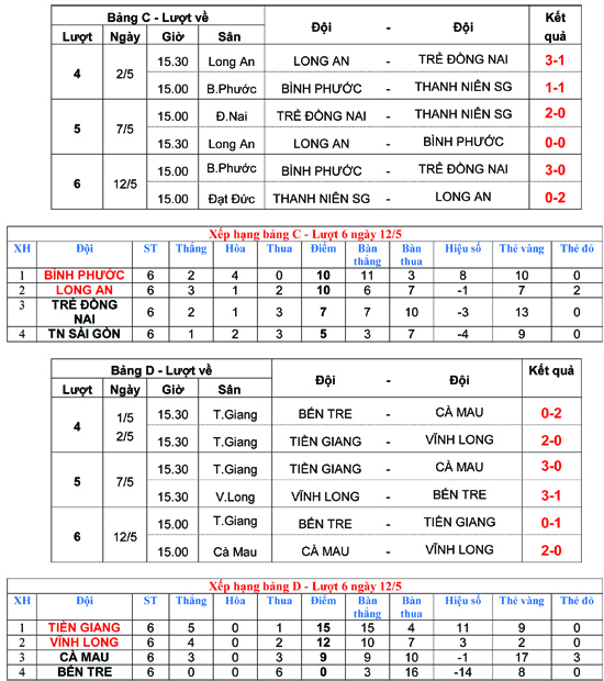 Riêng ở bảng D, Tiền Giang và Vĩnh Long do đã giành vé vào VCK nên trận đấu chiều nay chỉ mang ý nghĩa thủ tục đối với hai đội bóng này. Tuy nhiên, Tiền Giang vẫn có chiến thắng 1-0 trước Bến Tre để cán đích ngôi đầu bảng D. Trong khi đó, Vĩnh Long để thua Cà Mau với tỷ số 0-2. Dù giành chiến thắng trước Vĩnh Long nhưng Cà Mau vẫn không thể thay đối được thứ tự trên bảng tổng sắp.